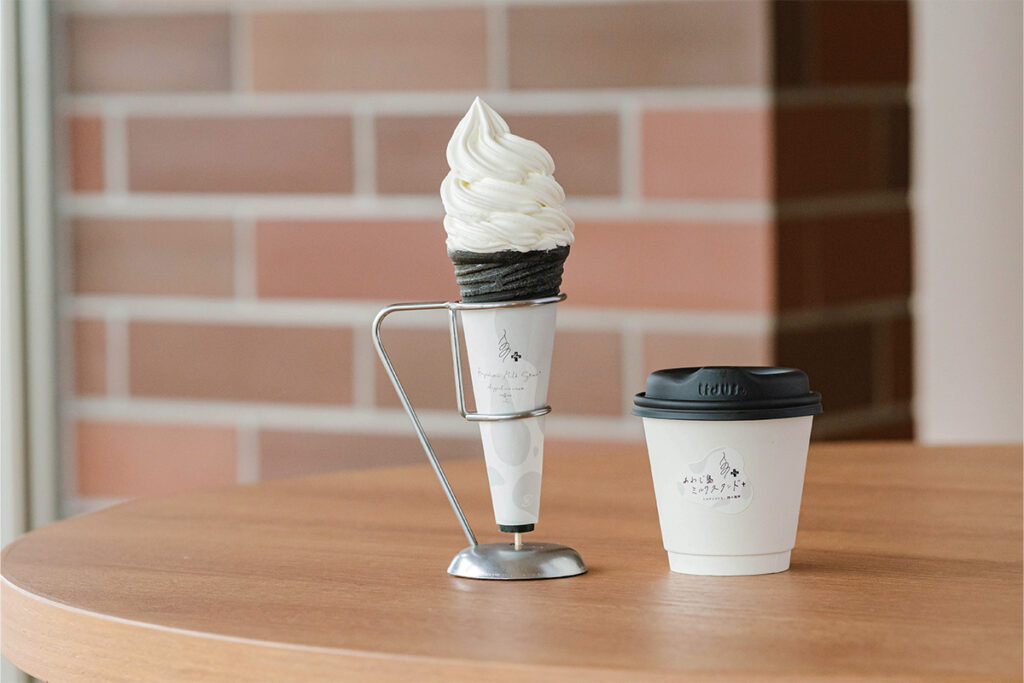 ミルクソフト専門店「あわじ島ミルクスタンド+( プラス)」では、独自配合で仕上げた究極のオリジナルソフトクリームをご提供いたします。濃厚で忘れられない絶妙な甘さが特徴。さらに「プラス」で、よりソフトクリームを楽しめるスイーツ、地元人気純喫茶【珈楽粋】のオリジナルブレンドコーヒーも。