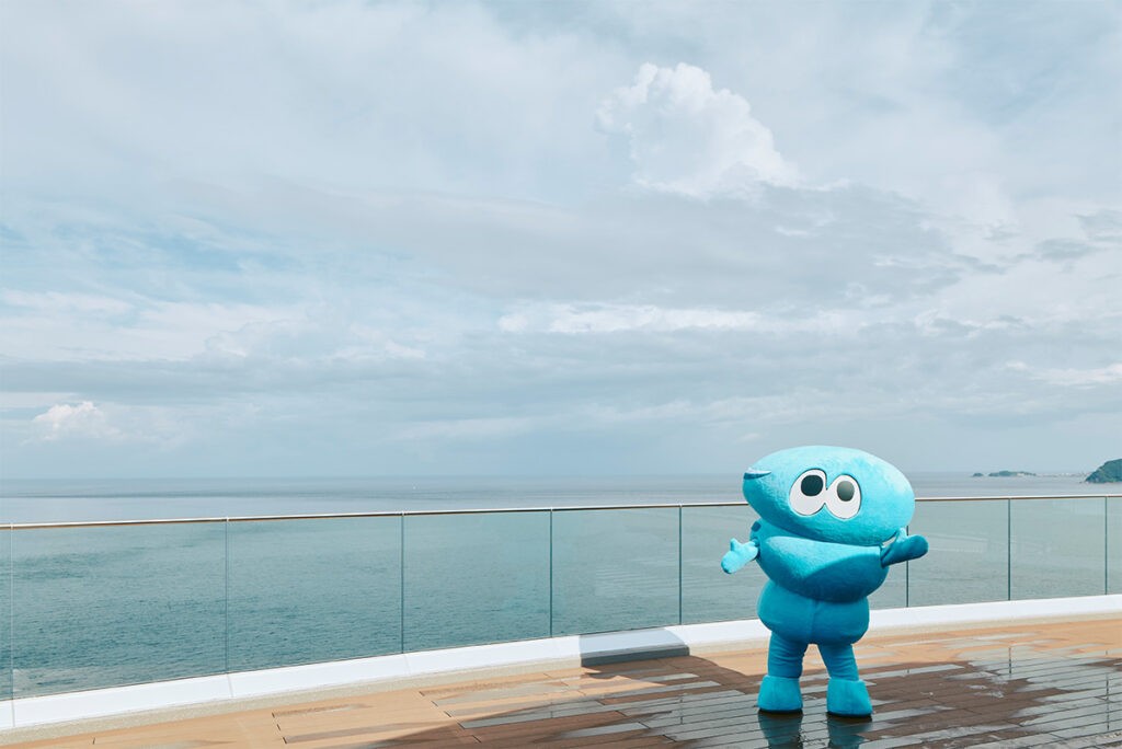 幅6m、高さ1.5mの巨大なデジタルサイネージ。四季折々のグルメや景色、アクティビティを抑えた映像コンテンツを上映。timelesz のメンバーである松島聡さんが制作した「うずしおビジョン」のシグニチャーキャラクター「淡路うず助」も画面上に登場し、地域の魅力を紹介します。