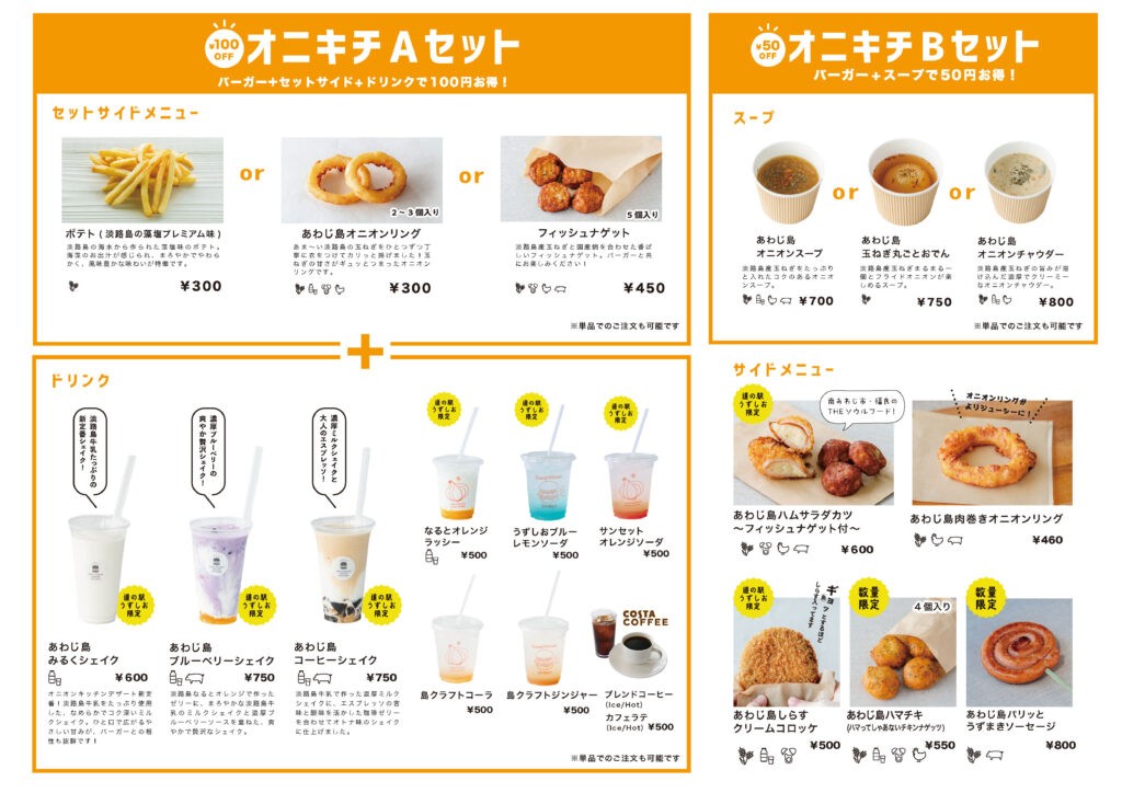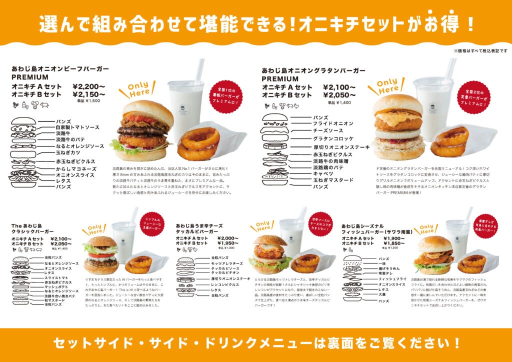 ご当地バーガーグランプリ1 位・2 位を獲得した「あわじ島バーガー」を、さらに進化させた「オニオンビーフバーガープレミアム」と「オニオングラタンバーガープレミアム」をメインに味わえるバーガーショップです。さらに今回はすべてのバーガーが新作!淡路島産の素材をふんだんに使い、見た目も味も満足感たっぷりで、ここだけでしか食べることができません!