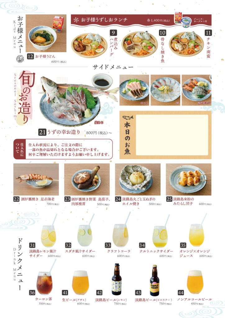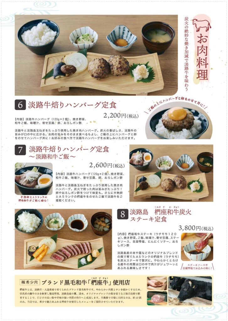 うずの幸から厳選される年間100 種類の旬の食材を活かした料理を、朝食とランチで味わえる食堂。メインは囲炉裏で焼き上げた旬魚、巾着炊き込みご飯、郷土料理の鯛そうめんなど、うずの幸を堪能いただける定食です。この他にも鳴門海峡近海の鮮魚をはじめ、淡路島特産の淡路島産玉ねぎなどの農産物、淡路牛などを取り入れた料理を提供予定です。