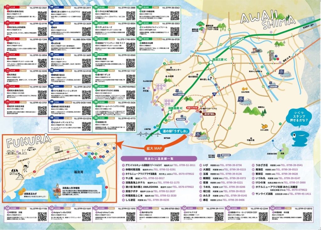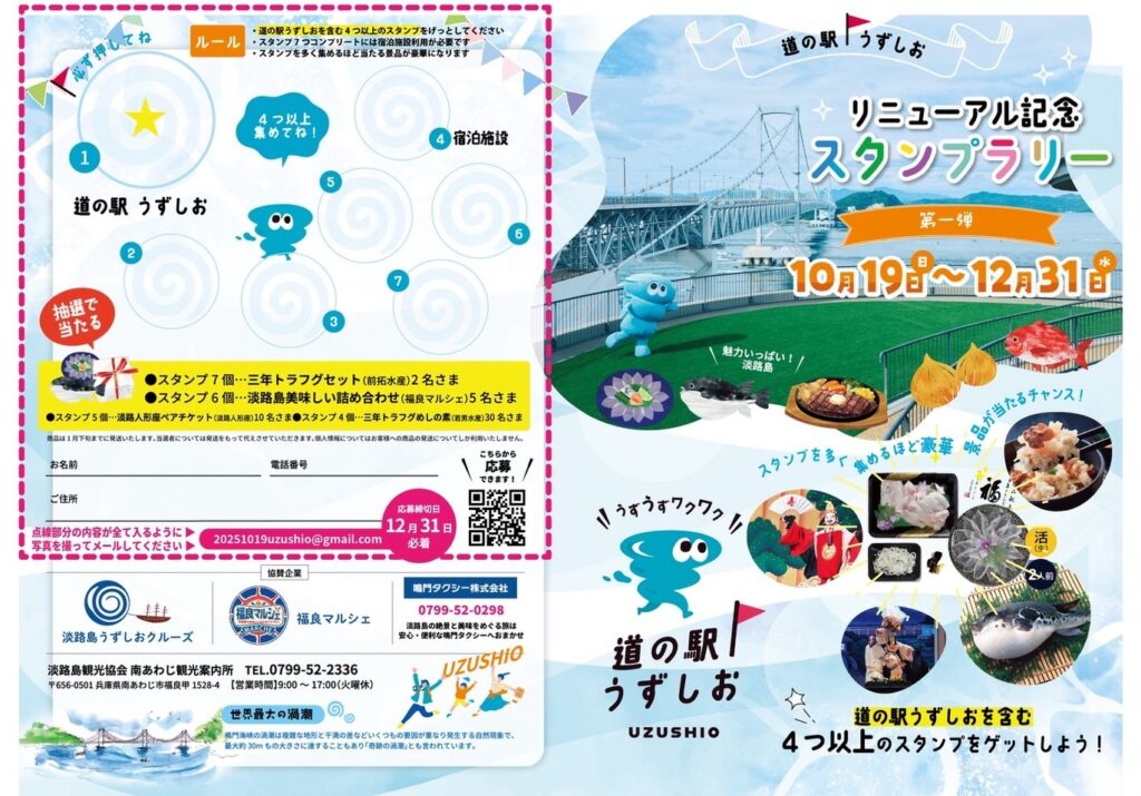 内容:道の駅うずしおをスタートし、南あわじ市内の魅力あふれる宿泊施設・観光スポット・飲食店・特産品店をめぐり、スタンプを4つ以上集めれば豪華景品が当たるチャンス!スタンプを多く集めれば景品がレベルアップしていく期間限定のスタンプラリーです!