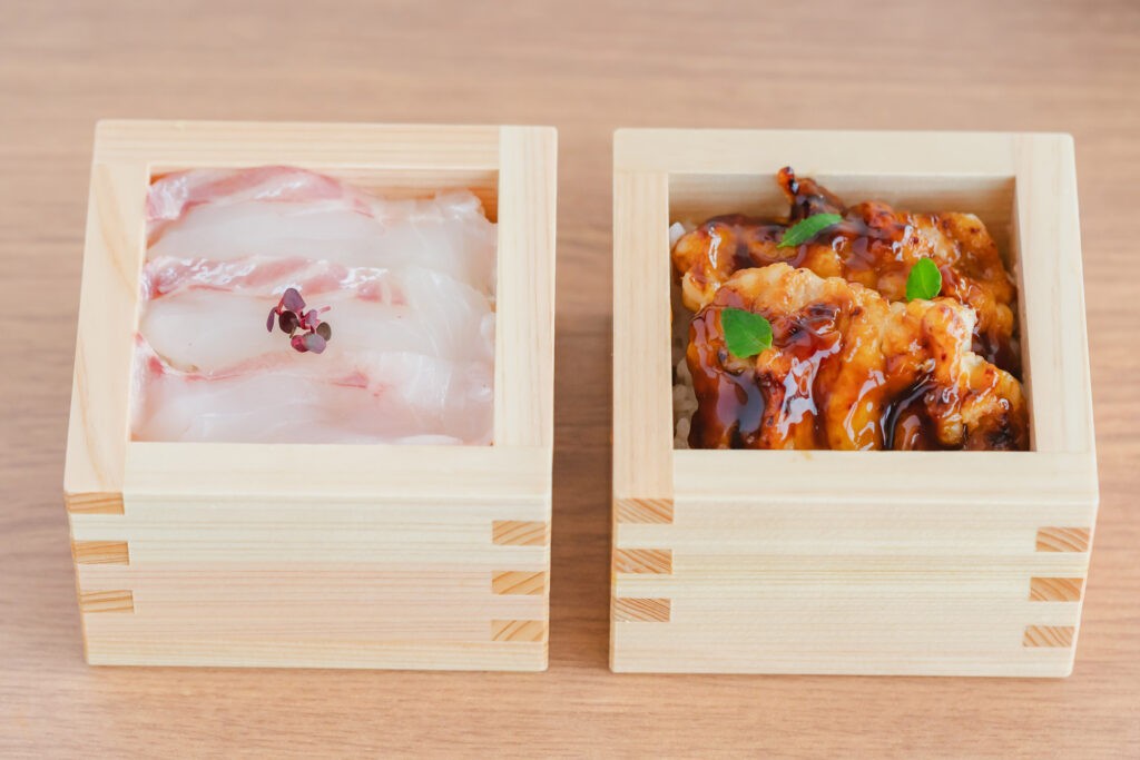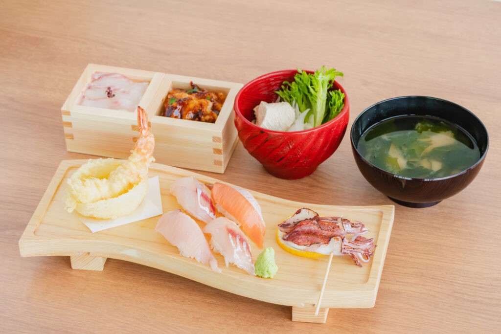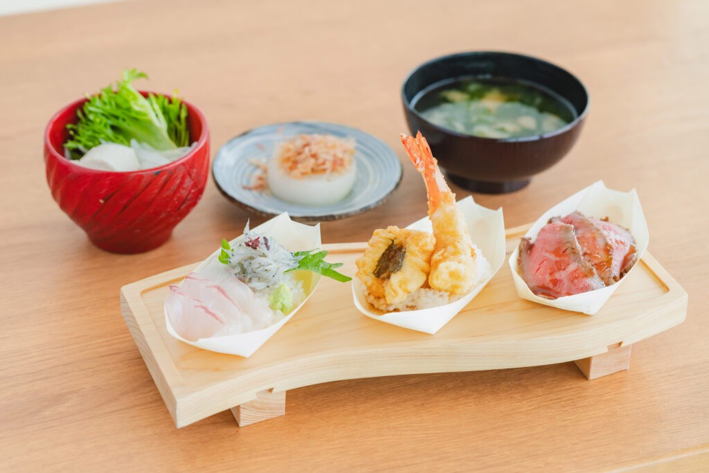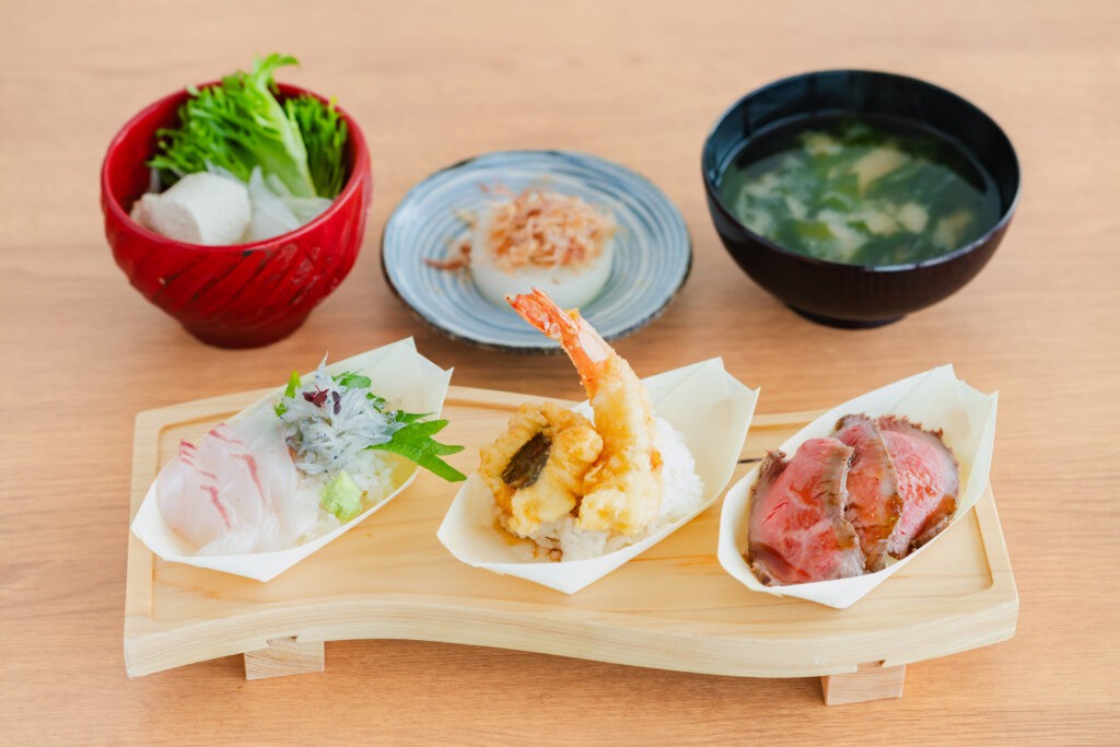 新鮮な旬魚のお造り丼、天丼、淡路牛のローストビーフ丼、3種のミニ丼で楽しめる定食です。